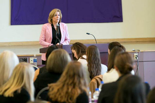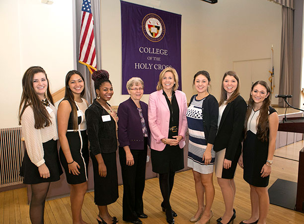 After the icebreaker, our keynote speaker, Anne Fink ’85, chief operating officer of PepsiCo North America Foodservice, took to the podium to share some words of wisdom. Fink delivered an empowering, engaging, and inspirational address to the students and alumnae in attendance where she touched on a variety of highly relevant topics, including the importance of maintaining strong values, the strategies of successful leaders, and the value of a Holy Cross education, among others. From Anne, we heard the importance of constantly seeking to learn, the necessity of positive leadership, and the significance of listening and staying true to ones values.