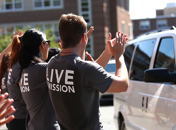 Even before their cars were parked, the 768 members of the Class of 2020 and their families were met by more than 350 volunteers β made up of student leaders, athletics teams, alumni, and staff β all excited to welcome them to the Holy Cross community.