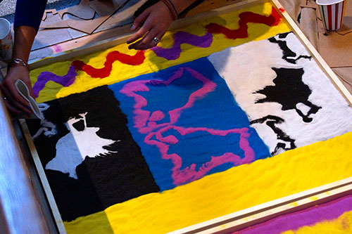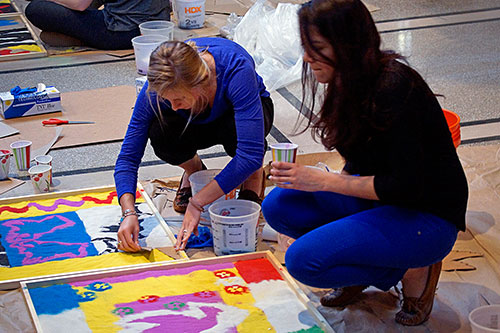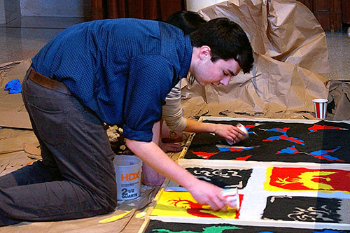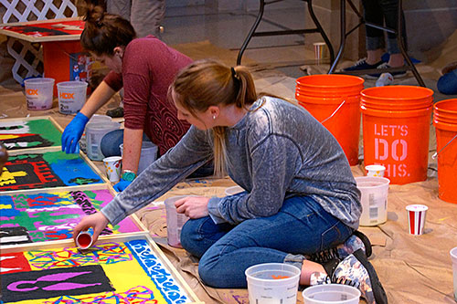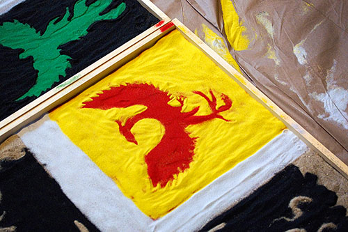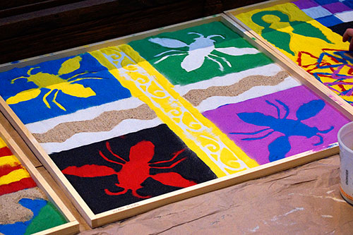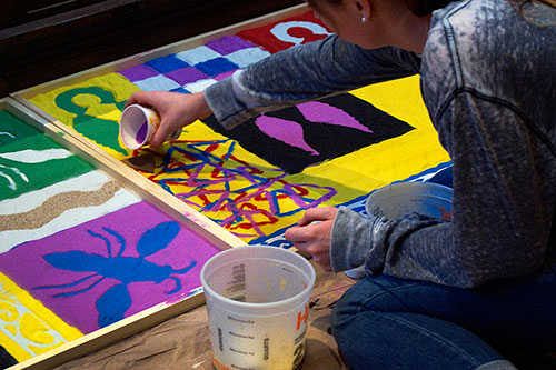 In this spirit, students in Fundamentals of Drawing with Susan Schmidt, associate professor of visual arts, have created a colorful sand carpet leading to the steps of the St. Joseph Memorial Chapel for Palm Sunday. Each student made cardboard shapes of “creatures with wings” to stencil layers of colored sand in their section of the carpet. The students’ designs feature angels, bees, a phoenix, dove and other birds, along with crosses and abstract patterns.