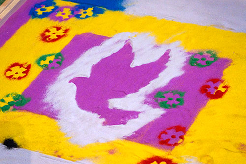 In Guatemala, Brazil and other Latin American countries, statues of saints are carried through the streets in elaborate processions during “Semana Santa,” Holy Week. Before the processions begin, people decorate the streets with carpets of colored sawdust, sand and flowers arranged in intricate designs portraying religious themes, animals, flowers, patterns, and their indigenous culture.