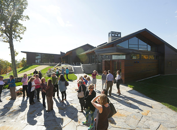 But the newest space is just a few miles away from campus, at the top of a hill in West Boylston with a view of nearby Wachusett Reservoir and quintessential New England foliage as far as the eye can see. The Thomas P. Joyce ’59 Contemplative Center is a 33,800 square-foot complex featuring a chapel, meeting rooms, dining room, and bedrooms for 60 individuals in a lodge-like atmosphere removed from the regular bustle of campus life. Holy Cross students, alumni, faculty and staff can be found here year-round, spread out across the vast 52-acre site, reading in the quiet nooks, writing in the sprawling woods, or speaking with spiritual advisors.