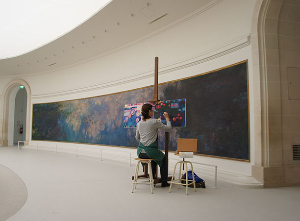 Thierry’s series of eight large-scale paintings were inspired by her rediscovery of the “Water Lilies” landscapes by Claude Monet on view at the the Musée de l’Orangerie in Paris. With special permission from the museum, Thierry painted in front of Monet’s originals over a period of 18 months from 2010 to 2012, where she explored the inner musical qualities of Monet’s famous paintings and visually interpreted them in her own. Exploring the perceptual phenomenon known as “synesthesia,” Thierry experienced the musicality she felt embedded in Monet’s semi-abstract impressionist paintings, which she then transcribed in abstract form, translating paintings into colored musical scores.