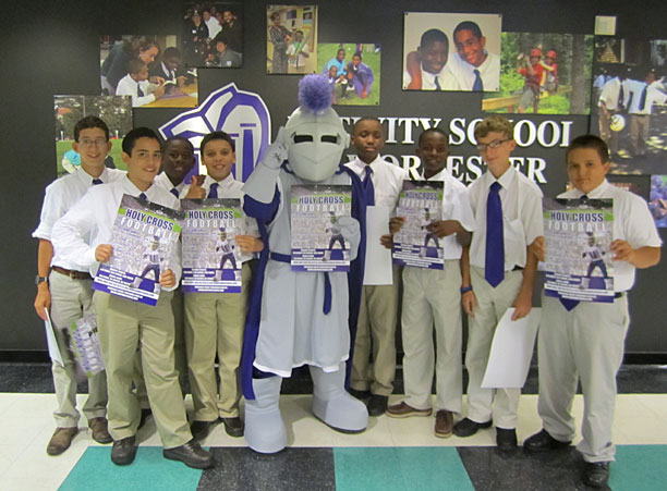 Earlier today at Nativity Worcester, the Crusader mascot stopped by to hand out football tickets to the big game and signed autographs for students. The school, which held its first day of classes today, is celebrating its 10th anniversary this year. Cofounded by administrators at Holy Cross and the Society of Jesus of New England, Nativity Worcester is an all-scholarship middle school serving 58boys of all religious backgrounds from the City’s most vulnerable neighborhoods.