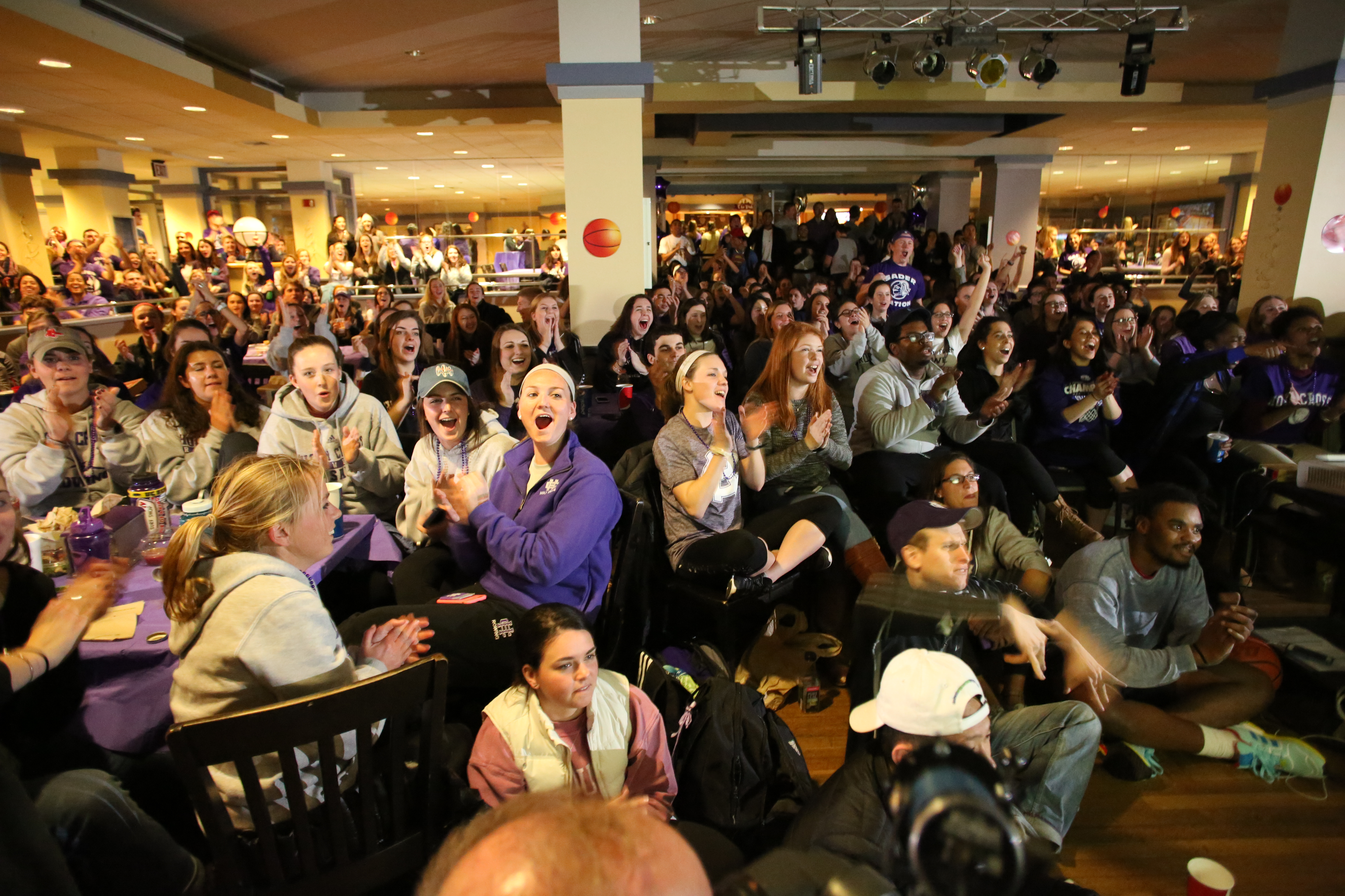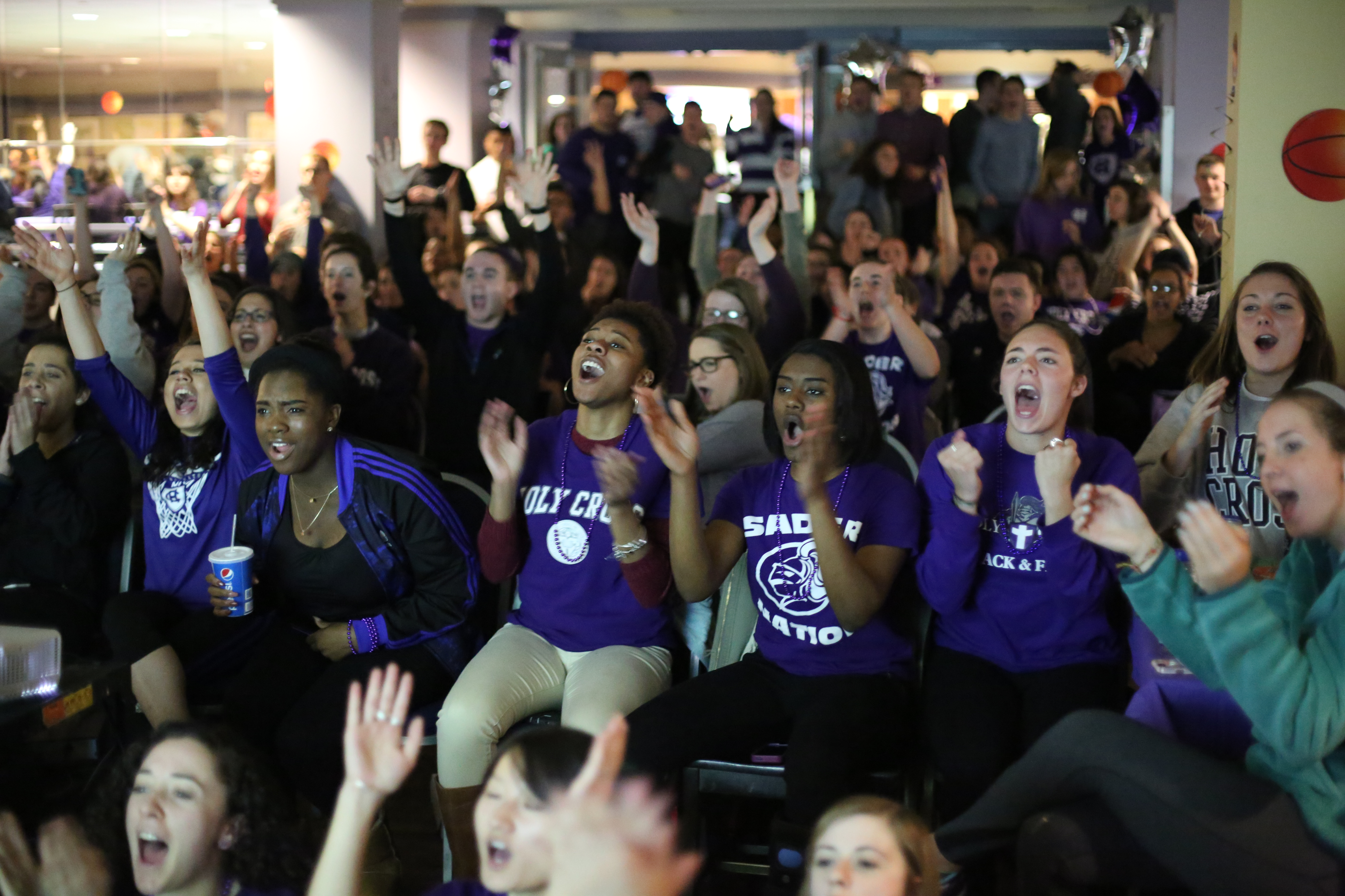 From Worcester to Boston, New York to Chicago, alumni, family and friends cheered on the Crusaders at more than 15 official watch parties. On campus, 350 students packed into an overflowing Crossroads to root for their Crusaders on the road.