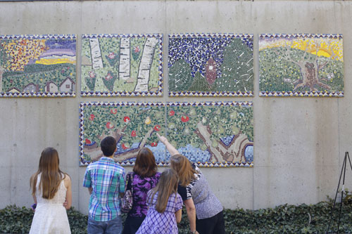 The six-paneled ceramic and glass tile mosaic, which stands three feet tall by 24 feet wide, depicts an apple and pear tree, representing Holy Cross and the neighborhood community respectively, with branches reaching towards each other, intertwining. The other four panels show scenes set in each of the four seasons.
