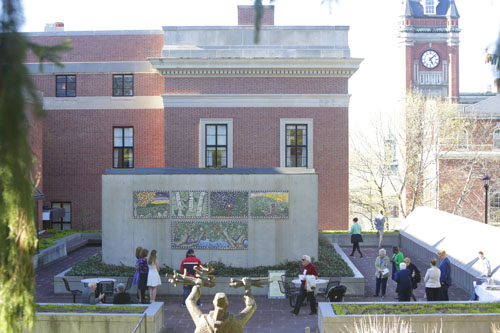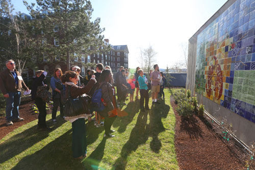 The garden became even more welcoming after becoming the home of the newly installed and dedicated tile mural “Lungs of the Planet.” The mural was constructed by the roughly 120 first-year students that make up the Natural World Montserrat cluster, in collaboration with the visual arts department, Worcester Center for Crafts, Dinand Library, and the Iris and B. Gerald Cantor Art Gallery; the project was spearheaded by Virginia Raguin, Distinguished Professor of Humanities and professor of visual arts.