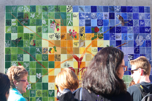 Tile mural and mosaic installations represent collaborative work of students, College, and neighborhood community