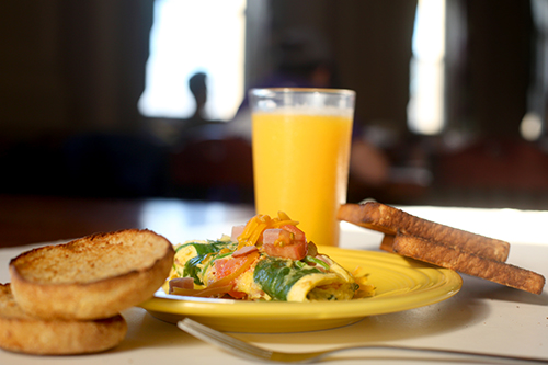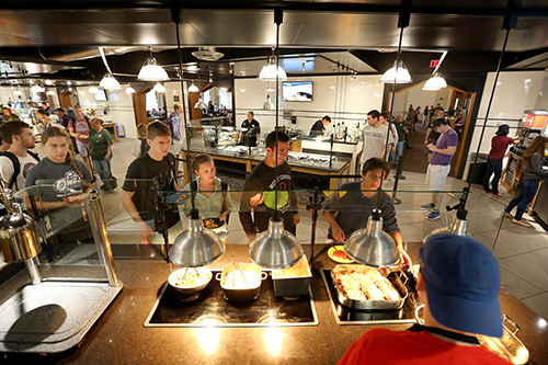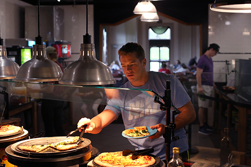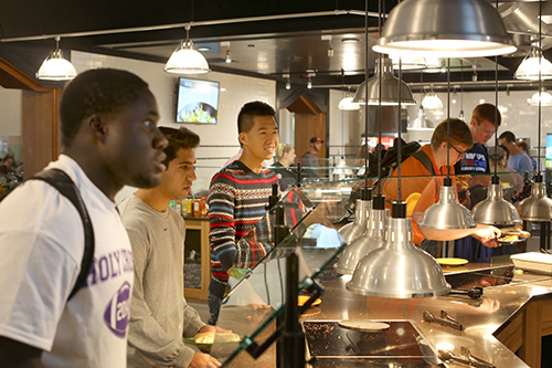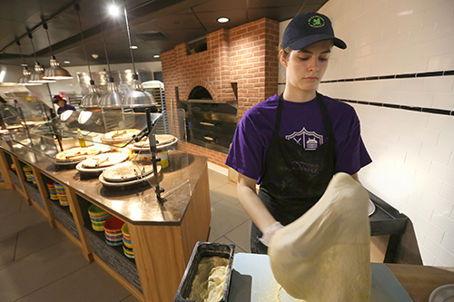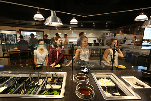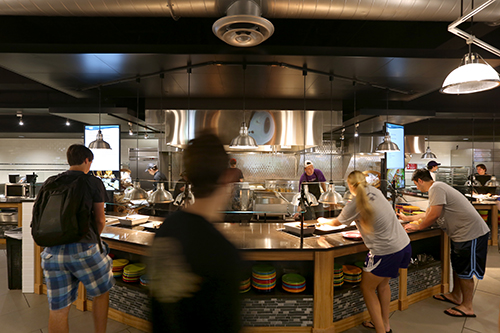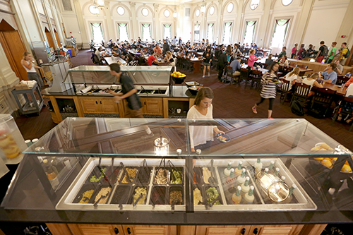 The new menus feature world cuisine, brick oven pizza, a super-food-inspired station, handcrafted deli sandwiches and made-to-order-style cooking. Food stations in the open-floor space include classic/entrée, breakfast, grill, stir-fry, pasta, soup, bread, pizza, deli, salad, and dessert (made daily in the campus bakery, the Kimball Sweet Shoppe). Other options include a fruit and yogurt bar with granola and fruit-infused filtered water.
