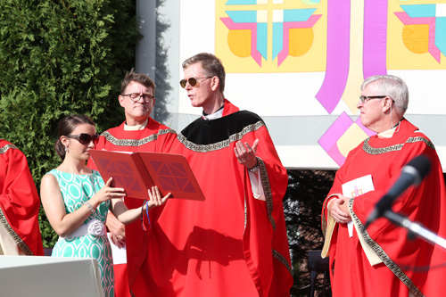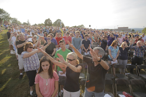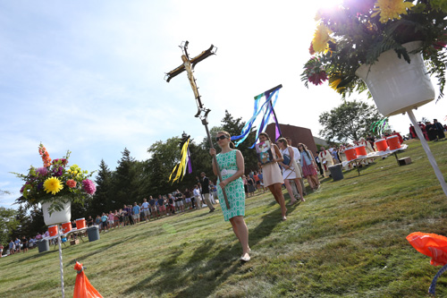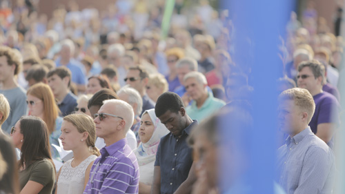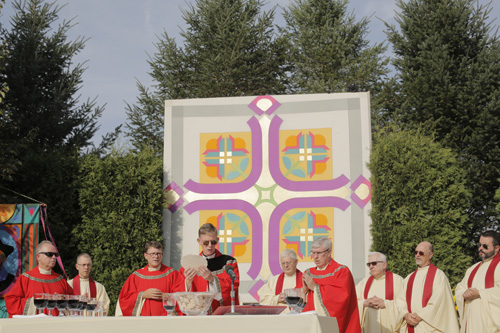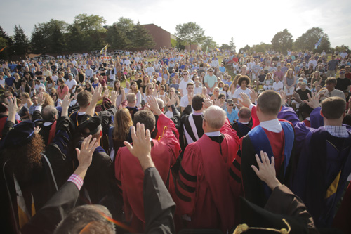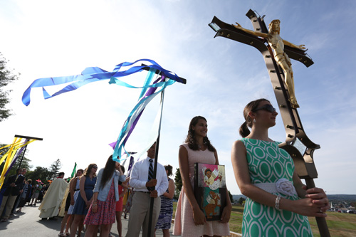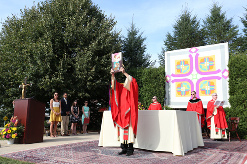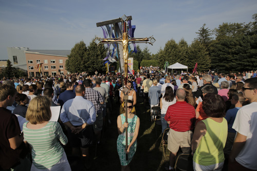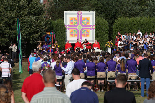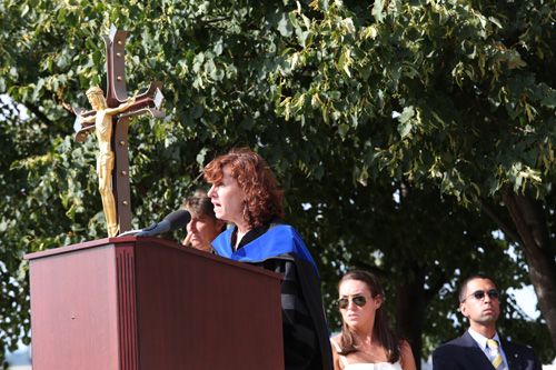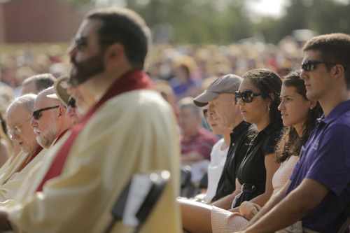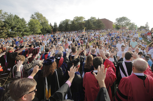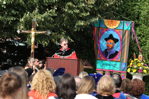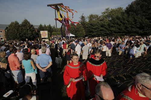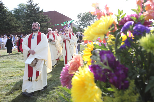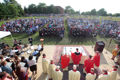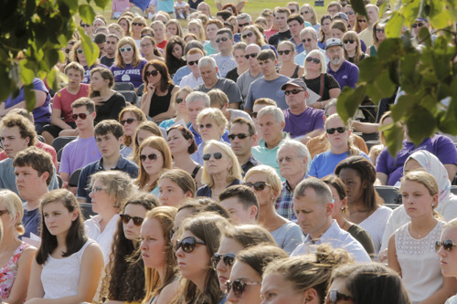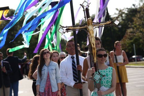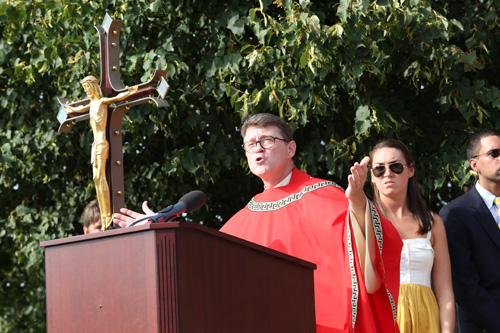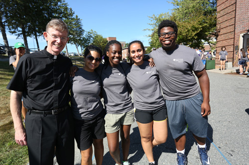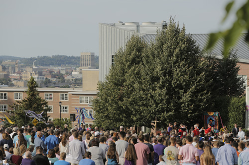 In the late afternoon, the hustle and bustle of move-in day turned into reflection during the traditional Mass of the Holy Spirit on the Hart Center Lawn. New students and their families were formally welcomed by Rev. Philip L. Boroughs, S.J., president of Holy Cross, and the new year was inaugurated at the Mass. Members of all faith traditions were in attendance at the Mass, which included the blessings of the new students by faculty and parents.