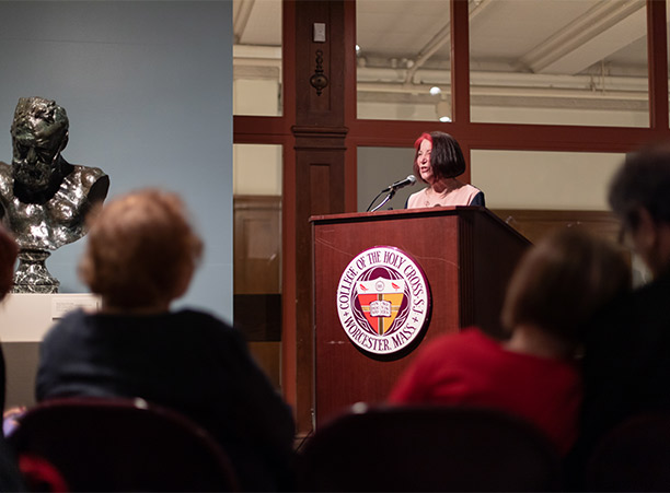 Amid the rough-hewn sculptures and before a packed gallery, Judith Sobol, the Cantor Foundation's curator of collections and exhibitions, and the organizer of the exhibition at Holy Cross, explained how Rodin's rejection of convention revealed new potentialities within art: "What Rodin wanted to show was people living the lives that they lived truthfully, using material to convey the structure of the body beneath the clothing. From this truth to what he saw around him, he was able to create a sense of life, not only of the people in Paris but also the life that sculpture could convey."